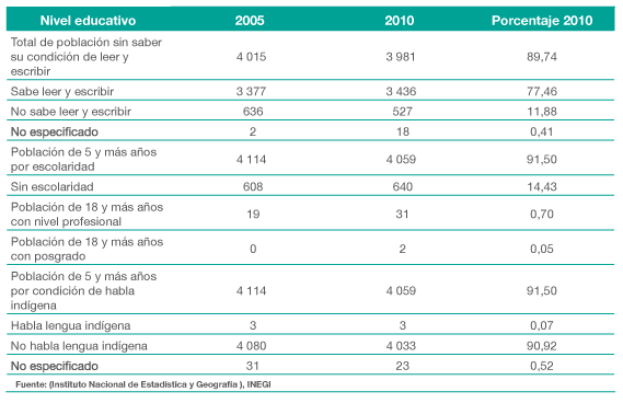 Hay 527 personas sin educación; 2 personas cuentan con Posgrado y sólo 3 personas hablan alguna lengua indígena.
