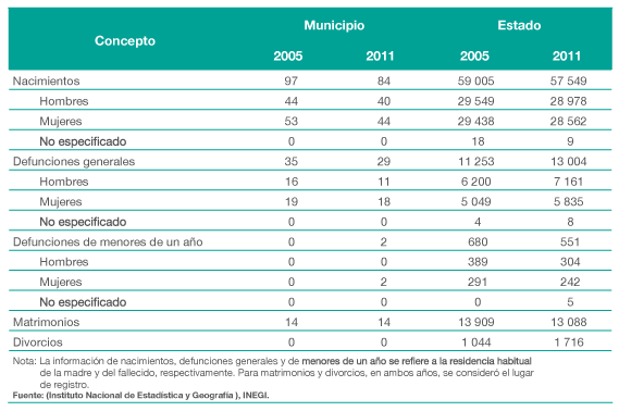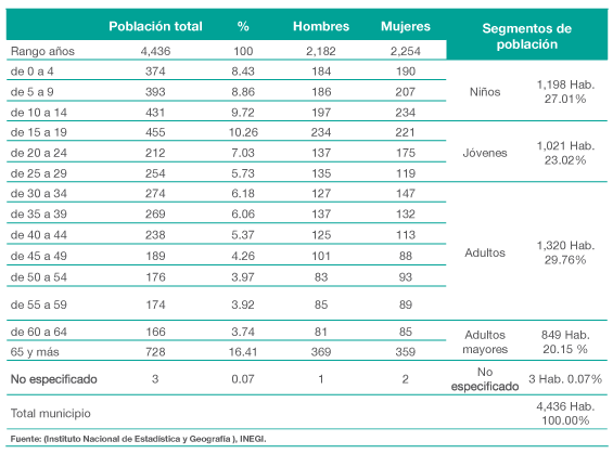 De acuerdo al Censo de Población y Vivienda 2010 efectuado por el INEGI, la población total del municipio es de 4,436 habitantes. Representando el 1.72 por ciento, con relación a la población total del estado. La relación hombres mujeres es de 96.81 y el promedio de hijos nacidos vivos es de 3.51.