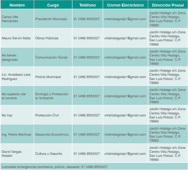 Dirección Postal: Jardín Hidalgo s/n. Zona Centro. Villa Hidalgo, San Luis Potosí. C.P. 78960